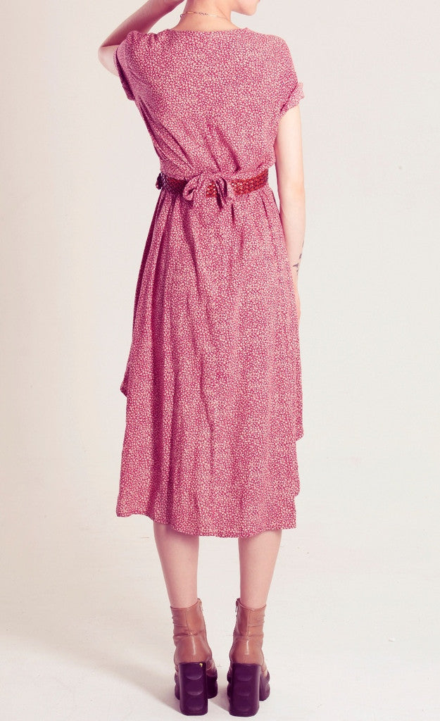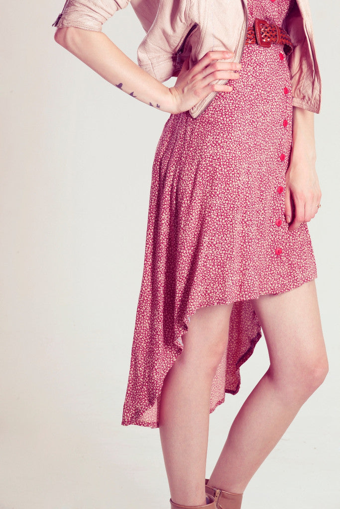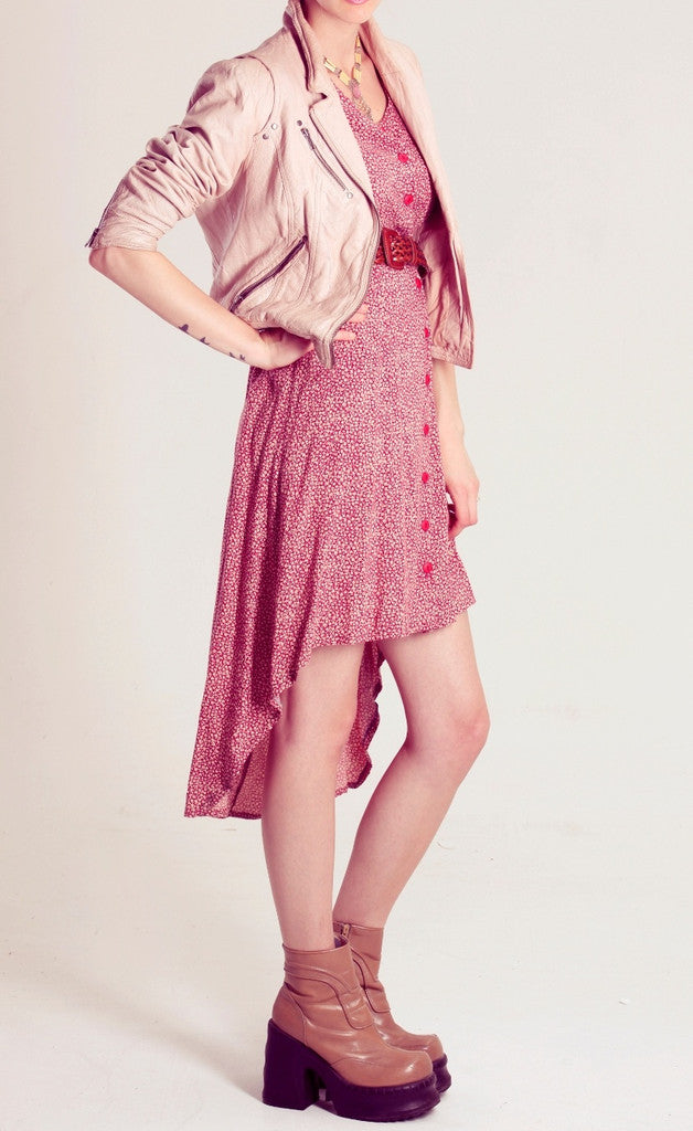 Reimagined 90s floral print cotton day dress with hi-low hem detail and waist ties. Work an off-duty look with a battered leather jacket and ankle boots.