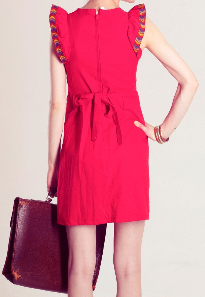 Red cotton folk dress with flared sleeves, waist ties and contrasting embroidery. Toughen this cute style with ankle boots and a biker jacket, adding heavy tights when the weather cools.