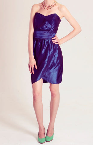 80s Strapless dress with boned bodice and tulip skirt. The fitted waist lends a sharp silhouette to this cool cocktail number. Off set the midnight hue with skinny gold jewellery and a box clutch.