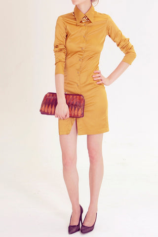 Shirt dress in stretch gold satin. A lesson in cool - we love the contradiction of sharp collar and sassy silhouette. Pick up the hue with plenty of gold jewellery and block heels.